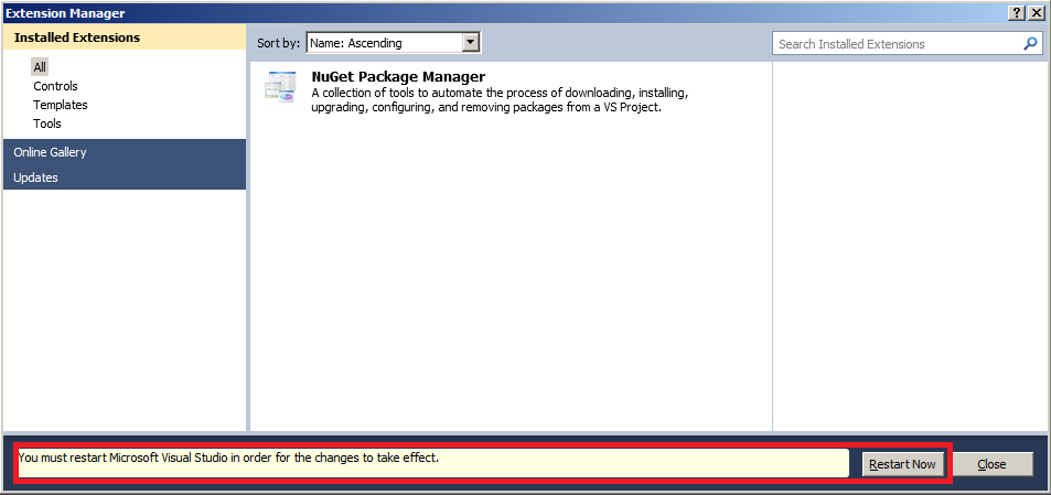 - Visual Studio will notify you that it needs to restart in order for the changes to take effect. If you’re willing select the “Restart Now” button