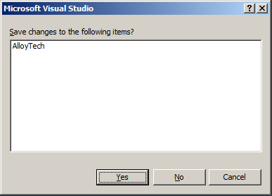 - If you had a project open and you didn’t save it as I mentioned in one of the first steps above hopefully Visual Studio is smart enough to ask you if you want to save first. In my case it was: