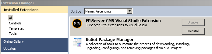Uninstalling EPiServer CMS Visual Studio Integration Extension