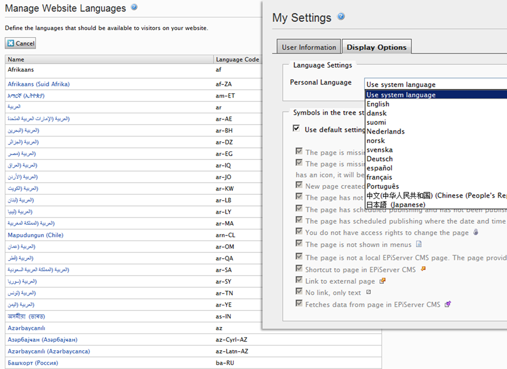 Language support for your sites can be configured by administrators in “Manage Website Languages” and each CMS user can select their language in the “My Settings” section of EPiServer CMS as pictured below.