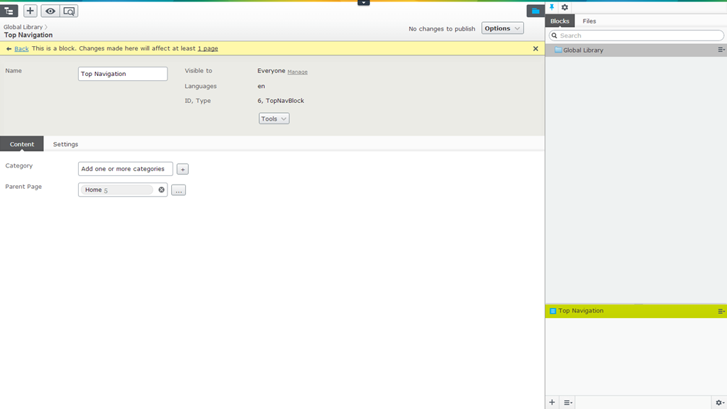 - Assets Pane > Blocks > Global Library > New Block - Name: Top Navigation, Block Type: TopNavBlock, Parent Page: Home