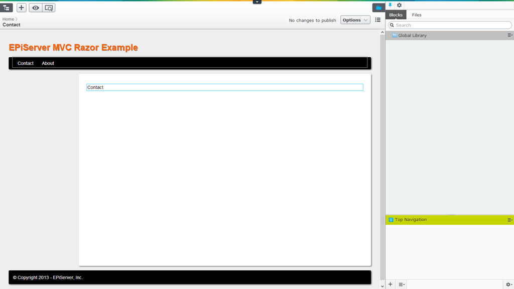 Now we will create and publish the About and Contact pages as children of the Home page so we have something to render in the Top Navigation block.