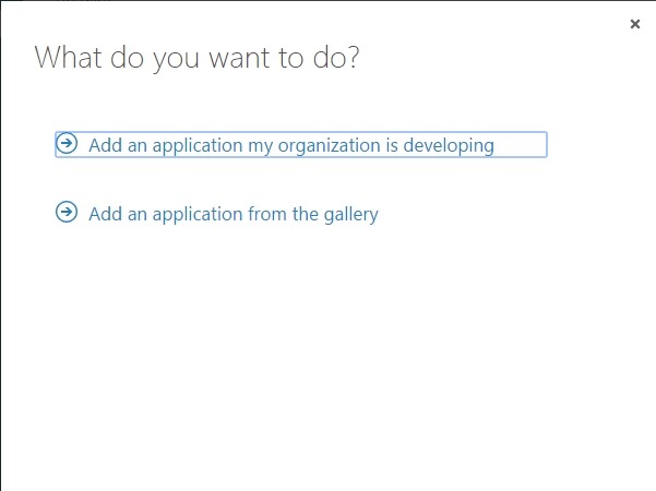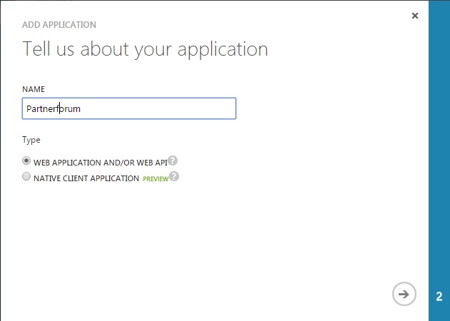 Open the Azure portal and create a new application in the Active Directory that you want to use for authentication, select the ADD APPLICATION MY ORGANIZATION IS DEVELOPING, enter a name and select WEB APPLICATION AND/OR WEB API.