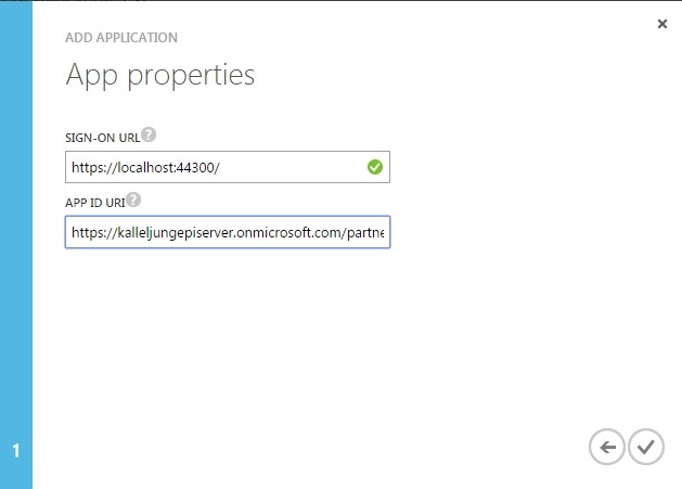 In the last section, enter the url to your site in the SIGN-ON URL field and a unique url to identify your application in the APP ID URI field, this is the url that you also should specify in the web.config for your EPiServer site , click the Complete button.