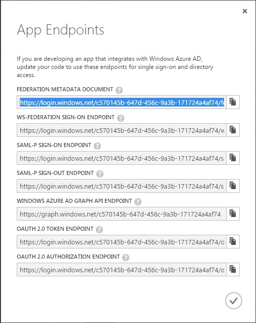 Once the application is created, we enter the configuration tab get the metadata url, click on the icon VIEW ENDPOINTS along the bottom to open dialog, highlight the field FEDERATION DOCUMENT METADATA and copy the value, this should also be pasted into the web.config.
