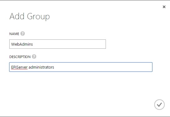 Select the GROUPS tab for your directory and click on ADD A GROUP, enter a name and click save, I choose to create a group named WebAdmins since this group has access rights to both EPiServers edit and admin interface as default.