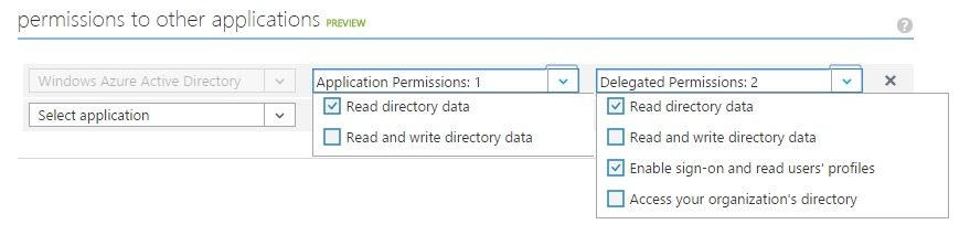 The last thing we need to do before we jump over to EPiServer is to set permissions so that the application can request and read the information via the Graph API, select Windows Azure Active Directory application and at least read access for the Application Permissions as well as Read directory data and Enable sign-on and Read users profiles for the Delegated Permissions, click save.