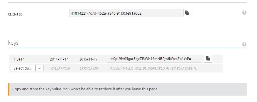 Copy the value from the field CLIENT ID and paste it to your web.config, we must also create a secret key that is used with the client ID when requesting the Azure's Graph API. Choose if your secret key will be valid for a year or two, and then click save, when the application is saved, you can copy the value of the secret key and paste it to the web.config.