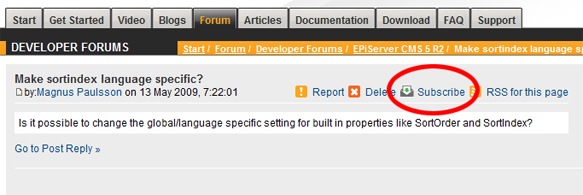 If you are a registered member and logged in to the site, you will now be able to subscribe to forum topics that you find interesting. All you need to do is go to the specific topic and click Subscribe. Your subscription will then push e-mails with links to the topics and answers automatically. The e-mails will go to the e-mail address that you use when you sign in to EPiServer World.
