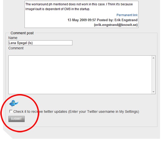 Use the new Twitter notification if you want to follow a specific blog post and the comments posted to it. After creating a Twitter account, go to the My Settings page on EPiServer World and add your Twitter user name. If you are logged in, you can then just select the check box on a blog post to activate the notification service.
