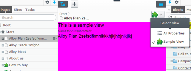 Now let us add the actual view. Since I want to be able to get a reference to the current content, I’ll use the base class ContentWebFormsBase. I create a new web forms view (The sample below does not use a code behind file) saved as “/UIExtensions/CustomView.aspx):