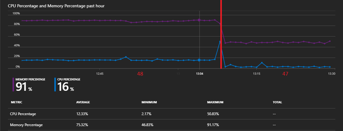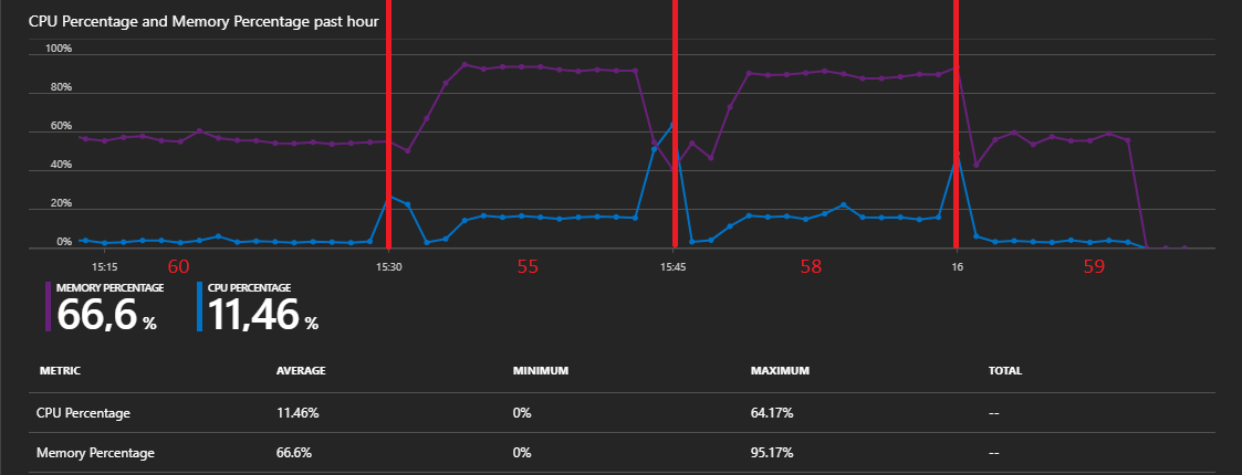 I deployed it to an Azure app service on an S1 (1.75 GB RAM) service plan and started loop in Powershell which will pass the Index method's cache parameter to insert 100 items totalling a little under 4 MB into the cache at 500 ms intervals.