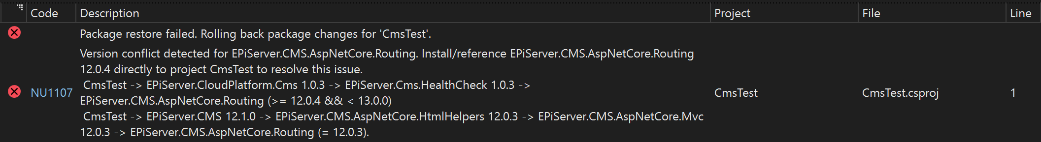 When you used to update something like the umbrella package EPiServer.CMS in the old packages.config world, nuget would also update (overwrite) all its dependencies, e.g. EPiServer.Framework. This is not the case with PackageReference. While transitive dependencies are implicit, direct dependencies are taken very explicitly. Sadly this can cause problems when updating a higher level package like EPiServer.CMS. Let's start from the state in the step before, and try to update EPiServer.CMS to 12.3.2, the latest version at the time of writing.