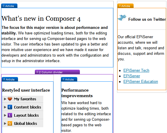The focus for this major version is about performance and stability. We have optimized loading times, both for the editing interface and for serving up Composer-based pages to the web visitor. The user interface has been updated to give a better and more intuitive user experience and we have made it easier for developers and administrators to work with the configuration and setup in the administrator interface.