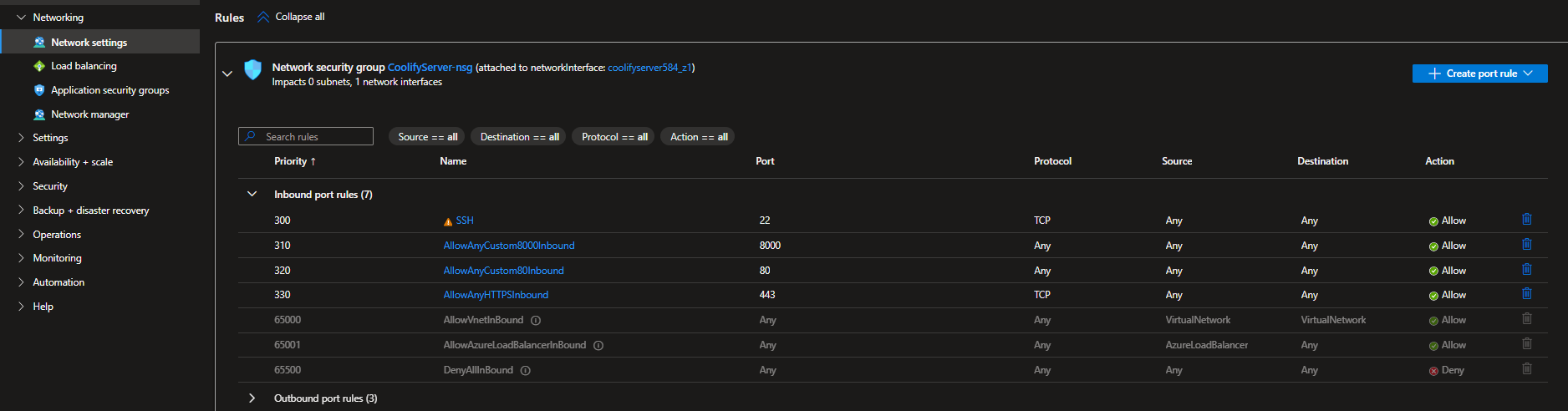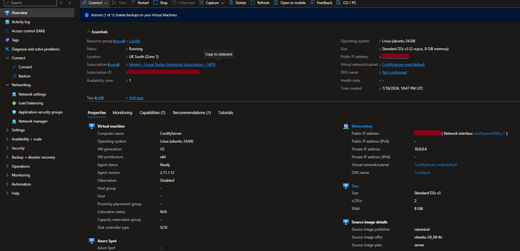 For this example, I chose to test Coolify on a Linux (Ubuntu 24.04) Virtual Machine. The setup process in Azure is straightforward, so I won't dive into each setup step, but here’s a quick overview of my configuration below: