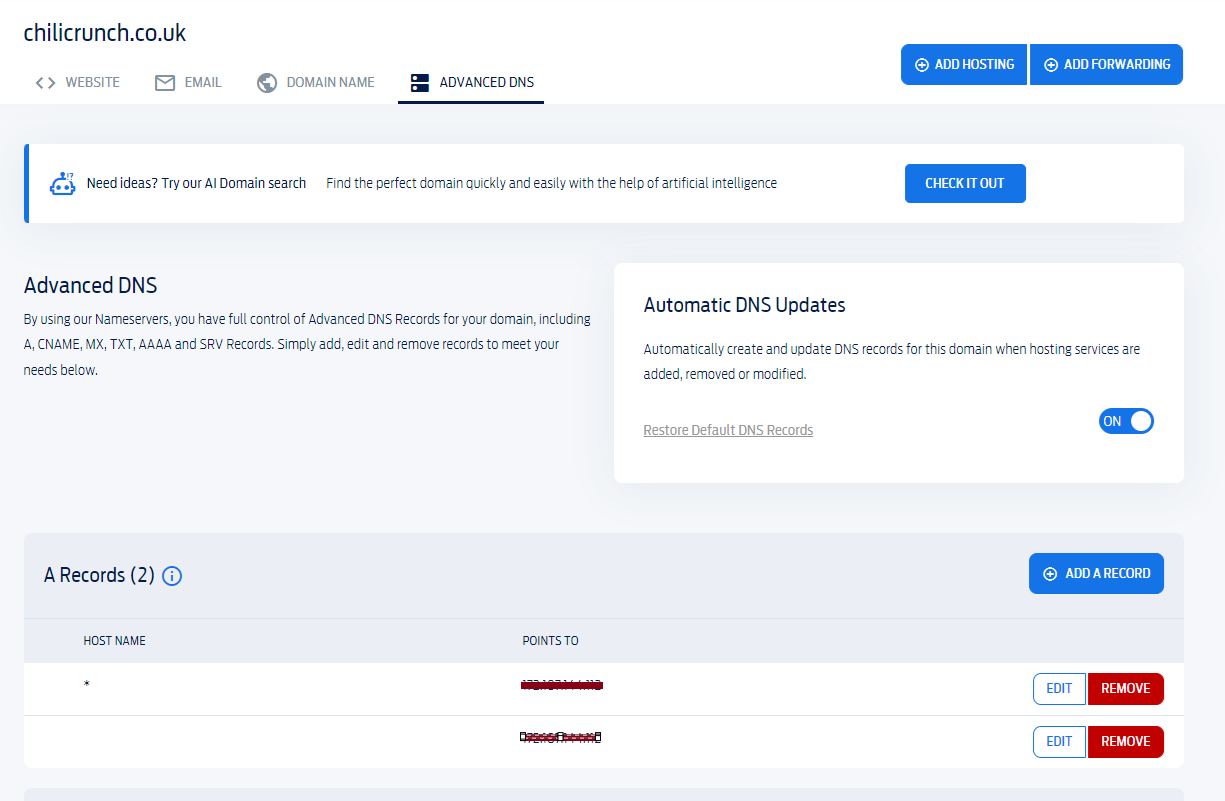 To make access easier, I connected a domain to my server. I used an existing domain from Fasthosts and made simple DNS changes by adding two A Records (@ and *), pointing them to my server’s public IP address.