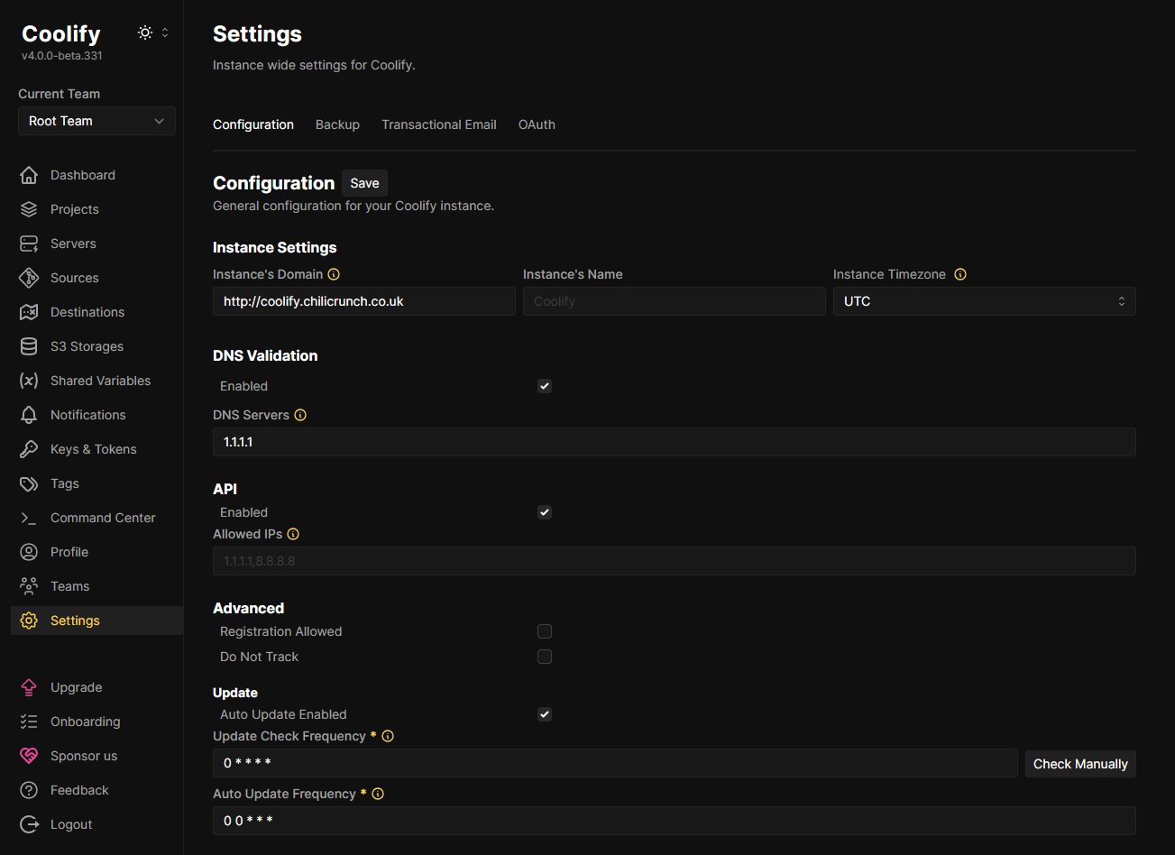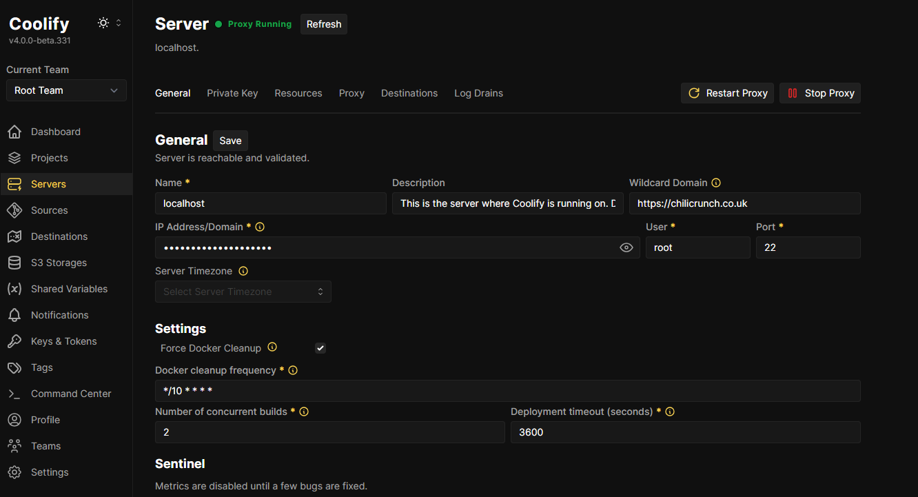 In Coolify’s settings, I configured the domain name for the control panel at http://coolify.chillicrunch.co.uk. I also set up Wildcard Subdomains to allow deployments to URLs like https://<my-project-name>.chilicrunch.co.uk/, similar to how Netlify and Vercel manage deployments.
