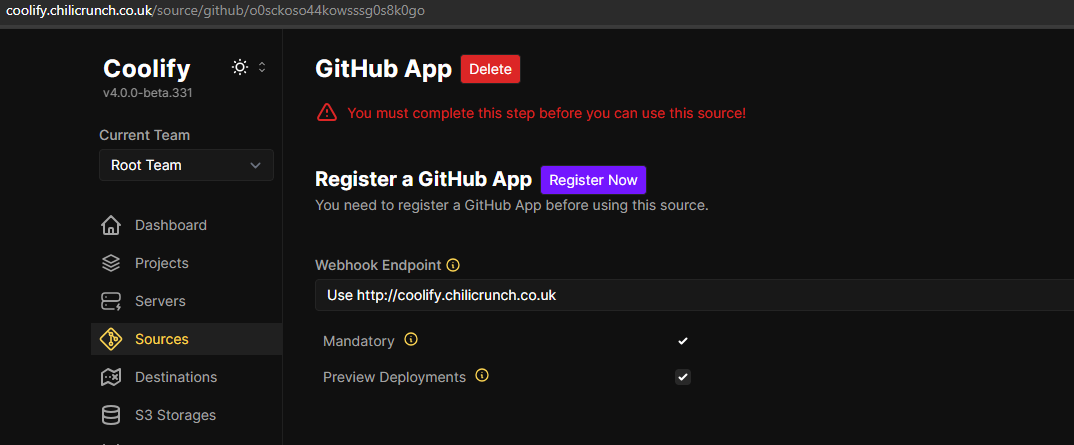 To enable continuous deployment, I connected Coolify to my private GitHub repository. Coolify supports several Git sources, but for this example, I used GitHub. You can add your GitHub repo by navigating to Sources and clicking Add. The process requires setting up Client ID, Secret, and Webhook Secret, which are generated during the setup.