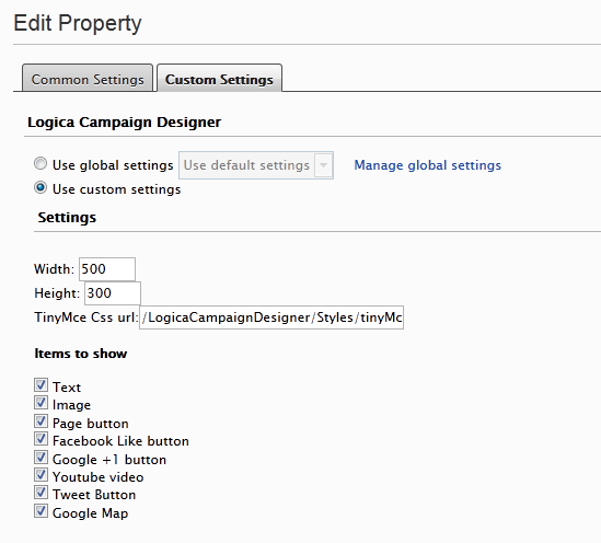 Another cool new feature is that we can now select what items we wish to include in the property for the editors, perhaps the editors don’t need the Like buttons, this can be changed by going to the custom settings page for the property and unselecting the checkboxs of the items you don’t wish to include, looks like this: