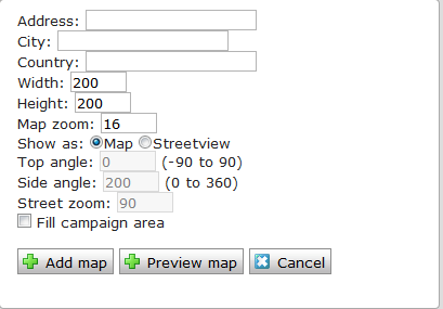 With my property the editors can now add a google map from the Add item button. When selecting the google maps item a dialog like this shows up: