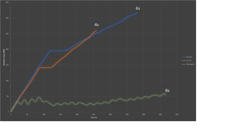 The Y axes is memory usage in megabytes and the X axis is time elapsed in seconds.