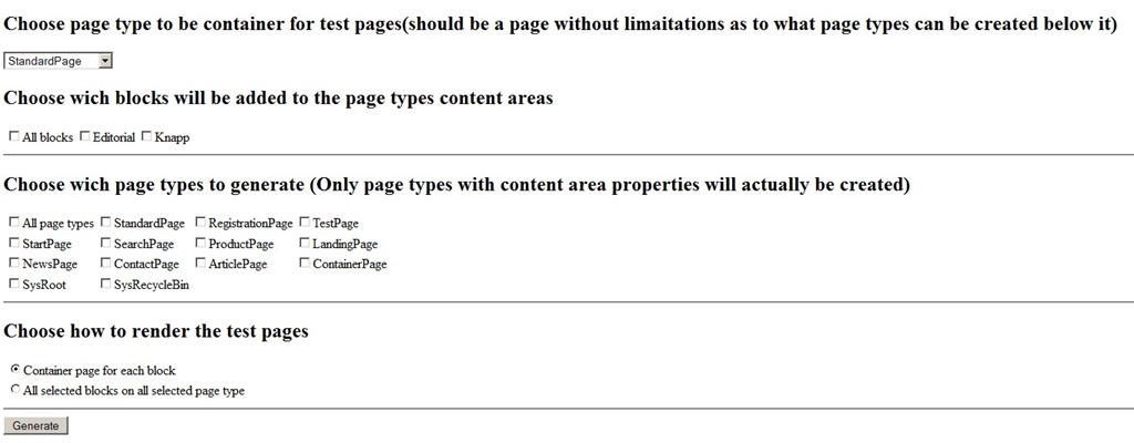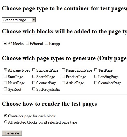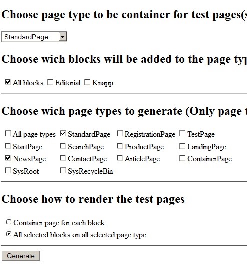 To make this process easier I have created a small tool. It generates test pages of your chosen page types adding the blocks you have chosen to all contentareas.