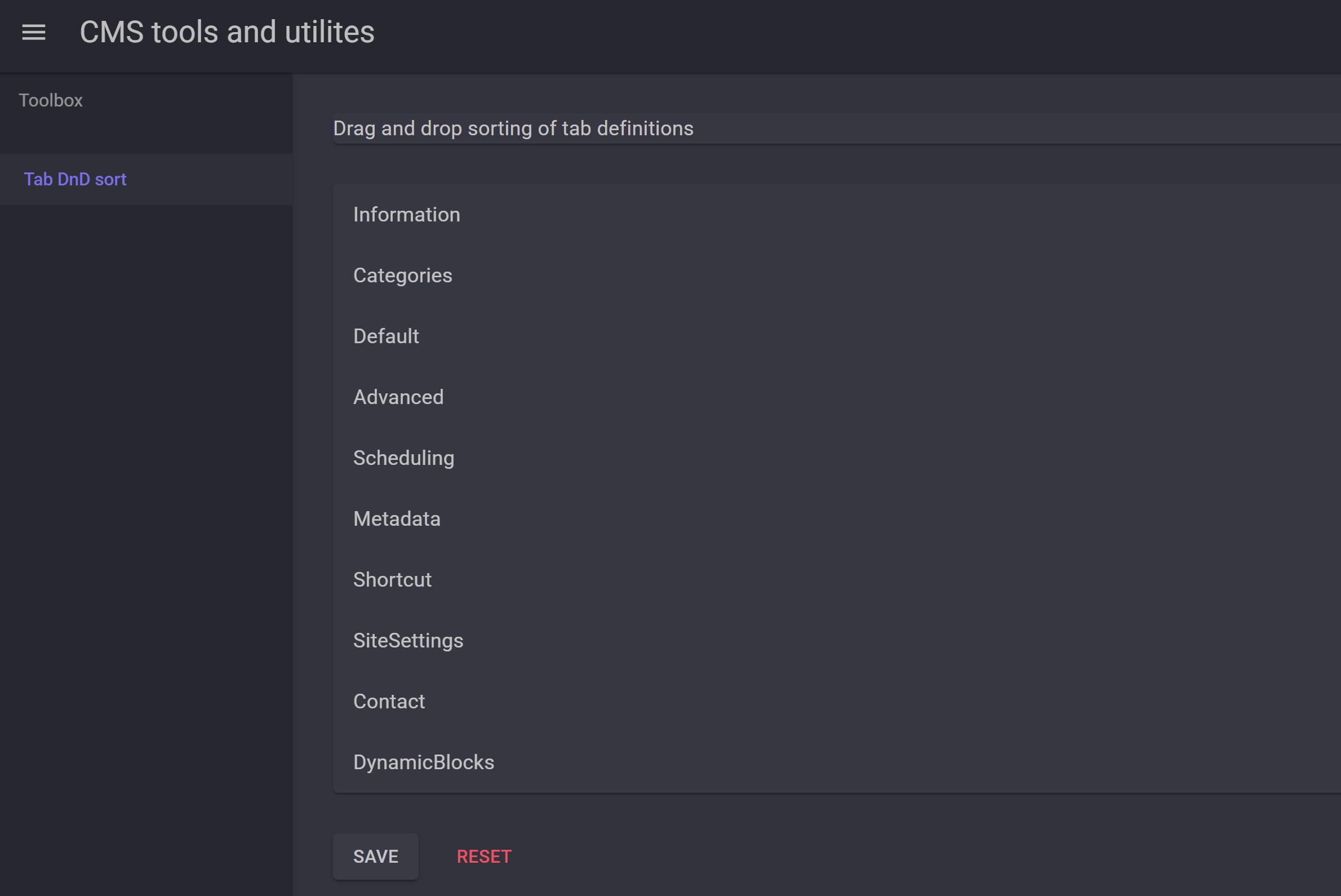 It's very simple, just a list of the tabs which you can reorder with drang and drop and then save or reset (only currently unsaved order). In the example it's wrapped into another component for a header and navigation but it's not included in the component.