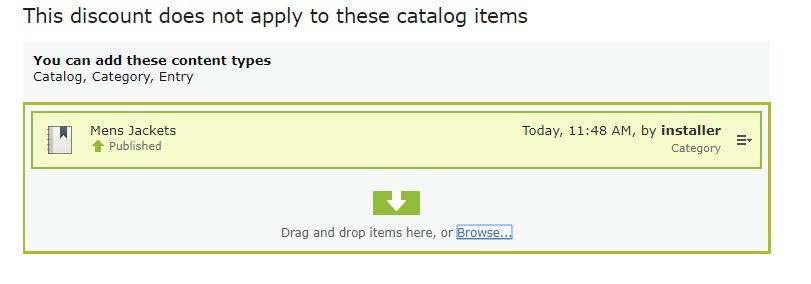 You can drag and drop catalogs, categories and entries to make them excluded by this specific promotion.