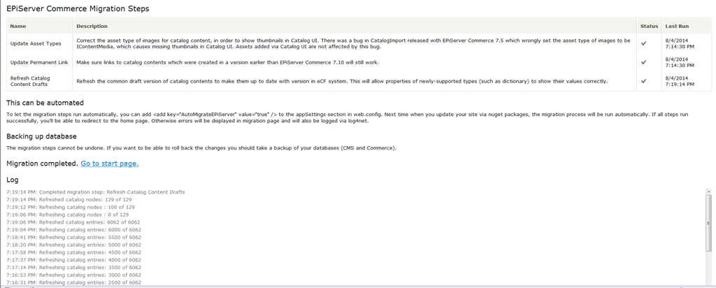 I am happy to note that the migration issues should be fixed in 7.10.1 and I was able to update a base Commerce 7.5 site with sample templates to 7.10.1. Via NuGet console, I installed EPiServer.Commerce and then ran “update-epidatabase” to get to the migration page on my Commerce site.