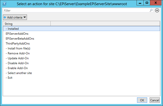 Get-EPiAddOns –ApplicationPath C:\EPiServer\ExampleEPiServerSite