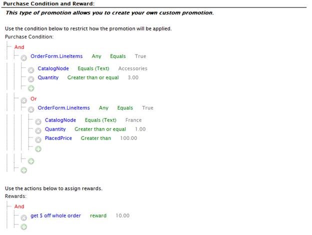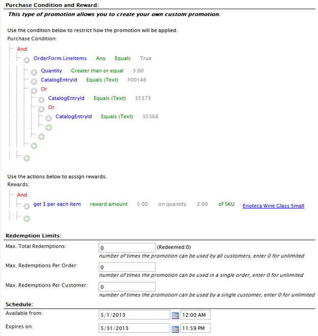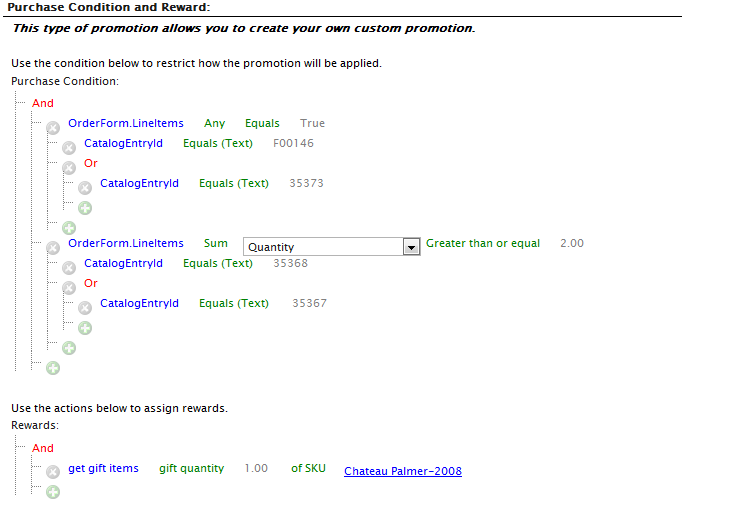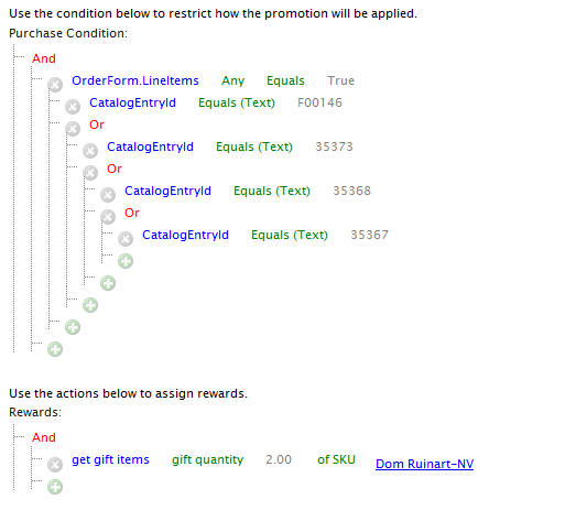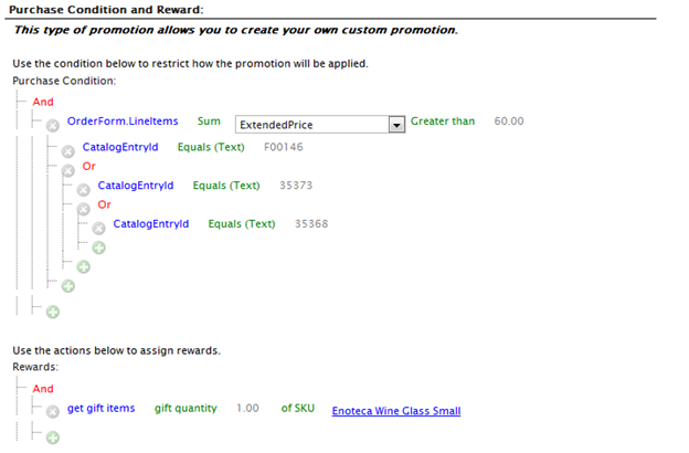 The ExtendedPrice of LineItems represents the total cost for a “row” in a cart. For example, if you are getting 3 bottles of wine at $10 each, your ExtendedPrice would be $30. CatalogEntryId is the code or ID associated with a SKU. This term is a little confusing because it is *not* the CatalogEntryId of the SKU. The hierarchy of the dynamic purchase conditions means that the condition looks for a combination of lineitems in the cart which match an ExtendedPrice sum of 60 and any combination of the SKUs that matched the CatalogEntryIDs separated by OR statements. If the ORs weren’t present, it would require all three SKUs to be present in the cart and have a total sum of extended prices more than $60.