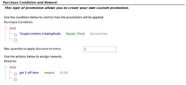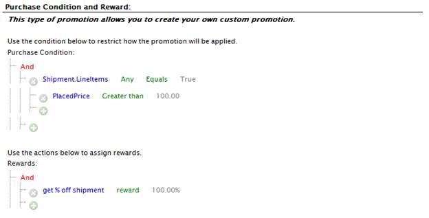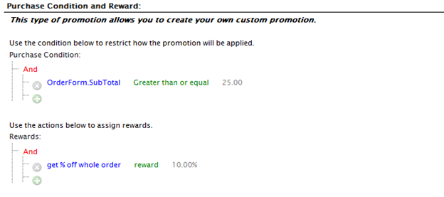 Sometimes the best way to learn how something works is to see some examples of how its used. Below are a number of promotion examples built in EPiServer Commerce (out of the box) that will illustrate how dynamic promotions work. Specifically, you’ll see how to customize the Build Your Own Discount promotion templates to create a wide array of discounts. They come in three flavors : Entry (for giving discounts on individuals SKUs, independent of the cart, like on a category landing page), Order (for cart discounts on the cart or items in the cart), and Shipping (for providing discounts on shipping charges). Here are the examples with some explanation.