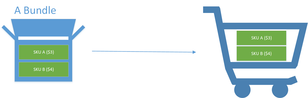 A bundle is a collection of SKUs that are simply grouped together for catalog-browse and add-to-cart purposes. There is no bundle-specific pricing or inventory. The pricing for a bundle is simply the total of the prices for the SKUs in the bundle. Inventory is tracked on the SKU level. A common scenario for using bundles is when an item usually needs to be bought in conjunction with other items in the catalog, like a phone and its charger.
