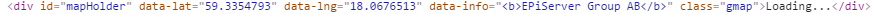 <div id="mapHolder" data-lat="@Html.DisplayFor(x => x.Latitude)" data-lng="@Html.DisplayFor(x => x.Longitude)" data-info="@Html.DisplayFor(x => x.Description)" class="gmap">Loading...</div>