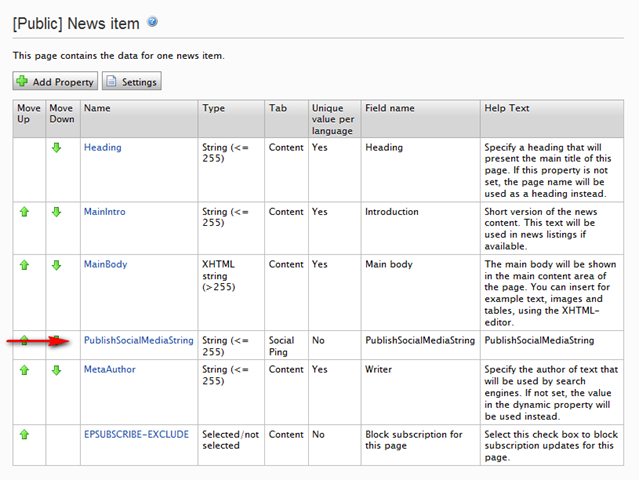 Now we have to define what to publish to the social networks when publish pages. We create a new property “PublishSocialMediaString” (string) to page type “News item”. Add this property to all page types you want to publish to your networks. I recommend to create a new tab for this property – just to separate this from the page content.
