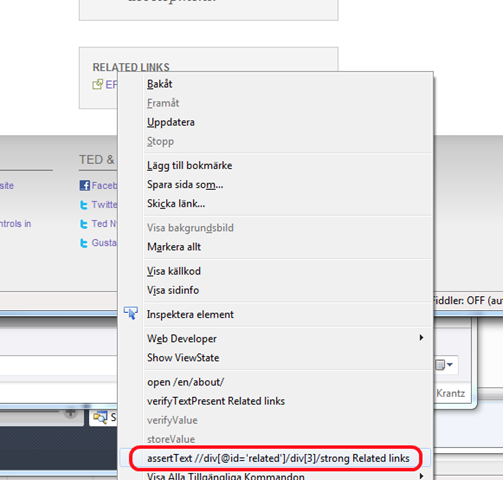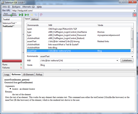 Fire up Selenium IDE and go to your favorite site. Hit the red record button in the top right corner to start recording. In the example screenshot I have recorded the steps involving login to EPiServer, a few clicks on the site, and I have added a few assertions about the pages.