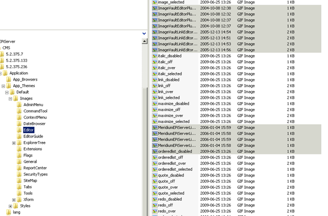 Copy the images (ImageVault* and Meridium*) from Program Files\EPiServer\CMS\version\Application\App_Themes\Default\Images\Editor