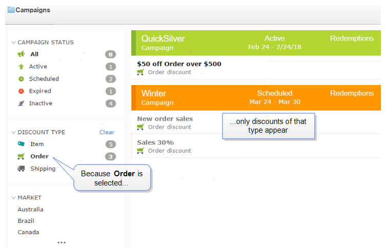 Now, a set of filters (also known as facets) appears in the left pane. If you select a campaign Status, Discount Type, or Market, it becomes bold, and the view is refreshed, showing only campaigns and discounts that include the selected items.