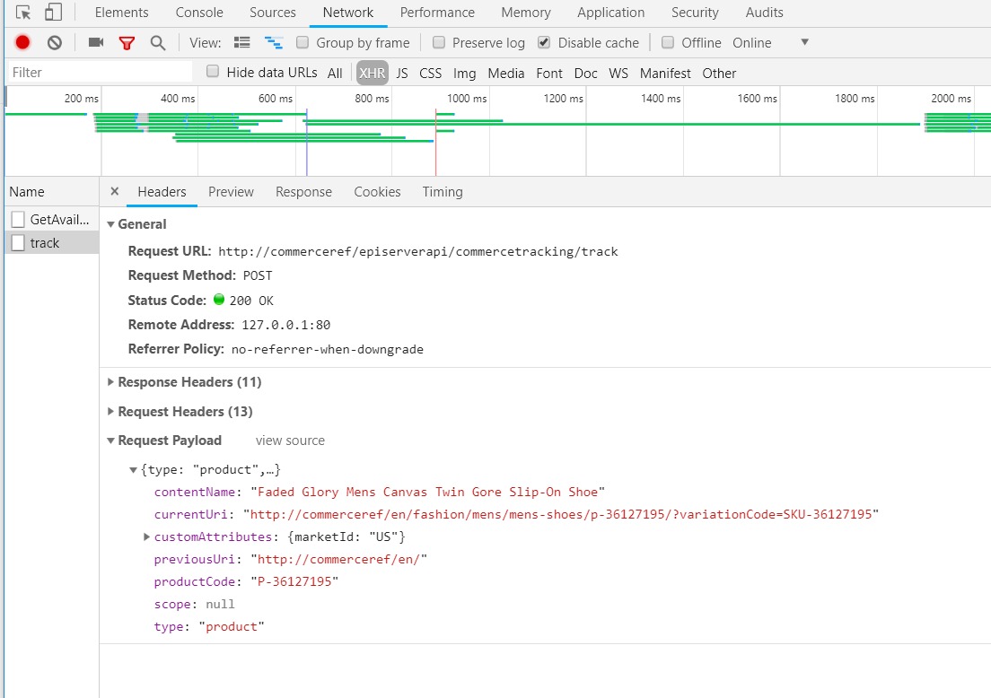 But now, instead of call to the end point of tracking service directly, we call to JS tracking API from the View. It will send a post request to web API with url '/episerverapi/commercetracking/track' and the tracking data collected in the client.