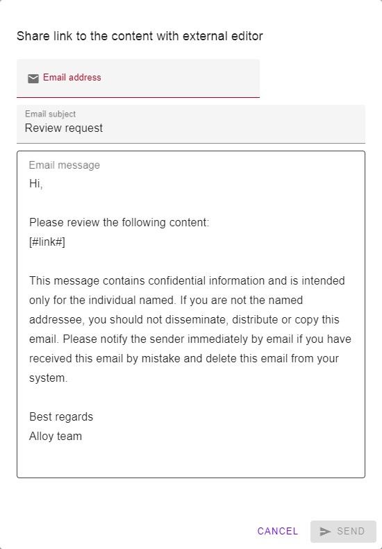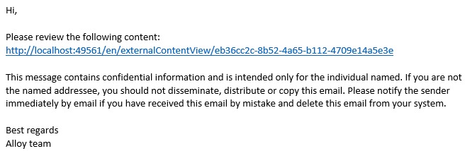 Editor can share external review links using share dialog. The [#link#] constant will be replaced with link to content.