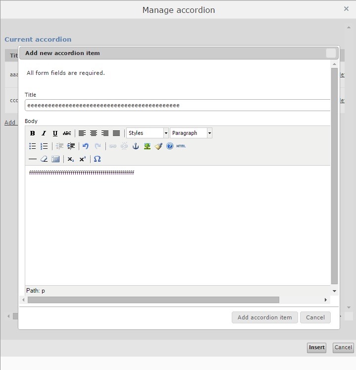 I'm using the tinymce editor as plugin for the episerver tinymce editor to create styled items for the accordion and the accordion itself. The chalenge was the setup to work episerver tinymce edtor and the classic tinymce editor along with jquery and tinymce jquery together.