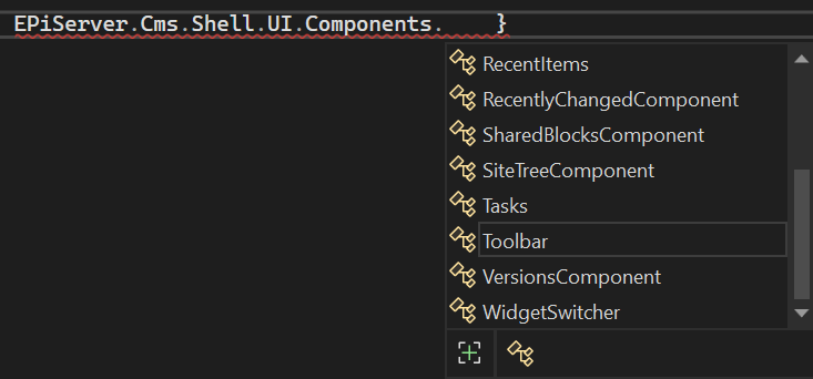 But for my requirement I did not found any value that could be used for global menu area in EPiServer.Shell.PlugInArea. So, I decided to check what pre-defined Components are available into the system. Among various predefined Components Toolbar was most closed to my requirement