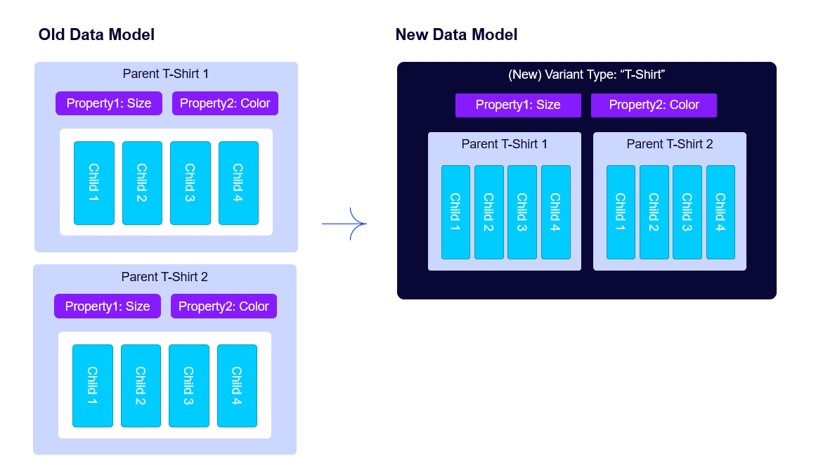 Using the old data model, if you had 100 "t-shirt" parent products that used size and color as the variant properties you had to configure the properties for each parent product. In the new data model, there will be a single "t-shirt" variant type with size and color assigned. Each parent product will be assigned to this variant type and inherit the property configuration for swatches, sort order, and display options from this variant type.