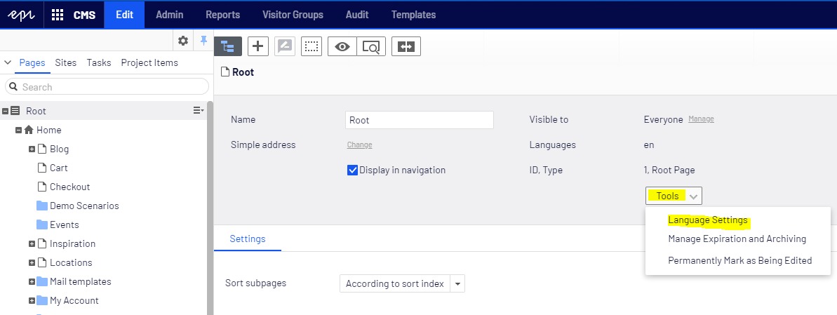 so far, we enabled globalization and we added the languages to the System. The third step is to set up the language inheritance hierarchy on the Content Items (pages) level. To do that, we need to go to the Edit mode of the CMS, click the Pages tab and select the Root node.