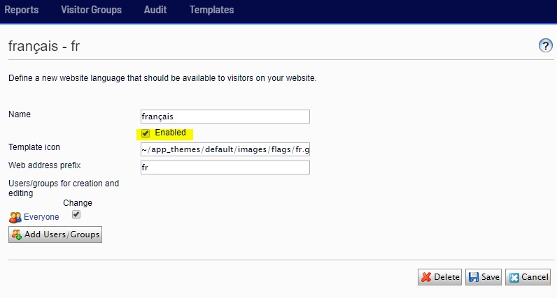 By default, the language will be available to all the internal users of the CMS. If you want to change this behavior click Add Users/ Groups