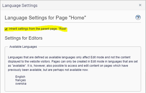 To apply the inheritance for this language setup for all subpages. Go to the Home node and make sure that Inherit settings from the parent page: "Root" is selected.