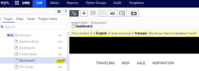 As you can see the page node is in Italic and its current language is English. There is a Yellow message on the top that says that this page doesn't exist in French. Two ways to create it in the new target language: