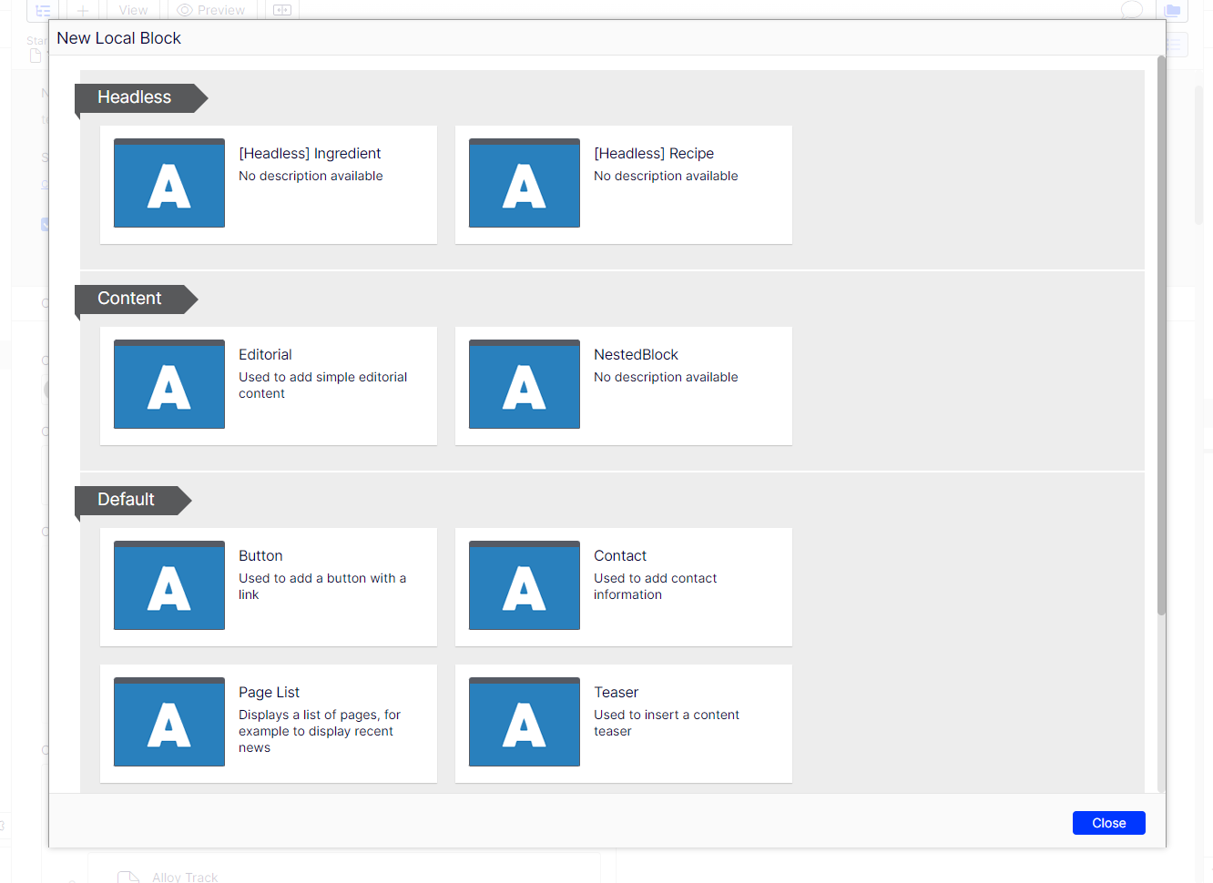 After that for ContactBlock and TeaserBlock instances Name will no longer be displayed in Create new block dialog and also the value of Heading property will be used in Content Area editor.