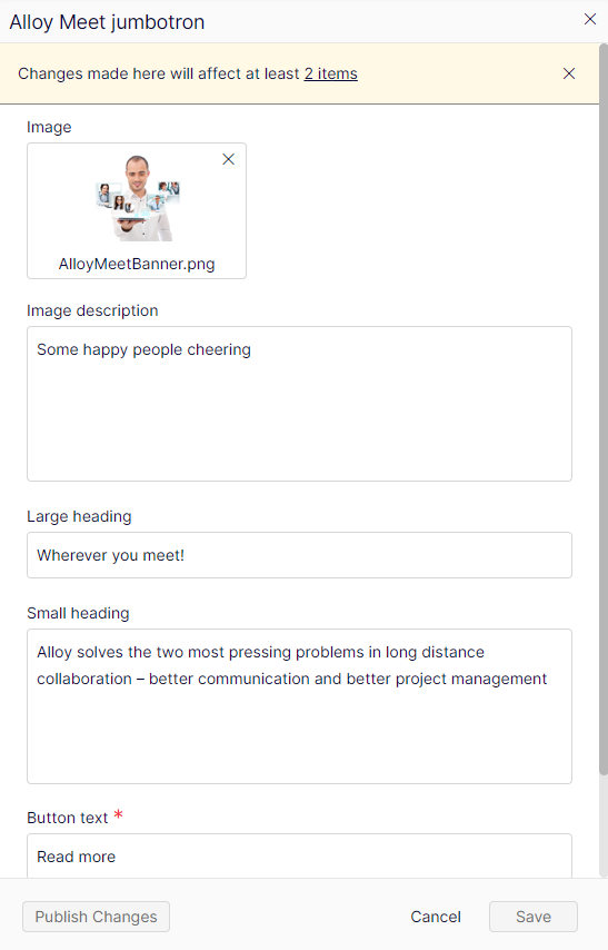Let's say we publish the page now but after a while editor decides to change the test on our ButtonBlock