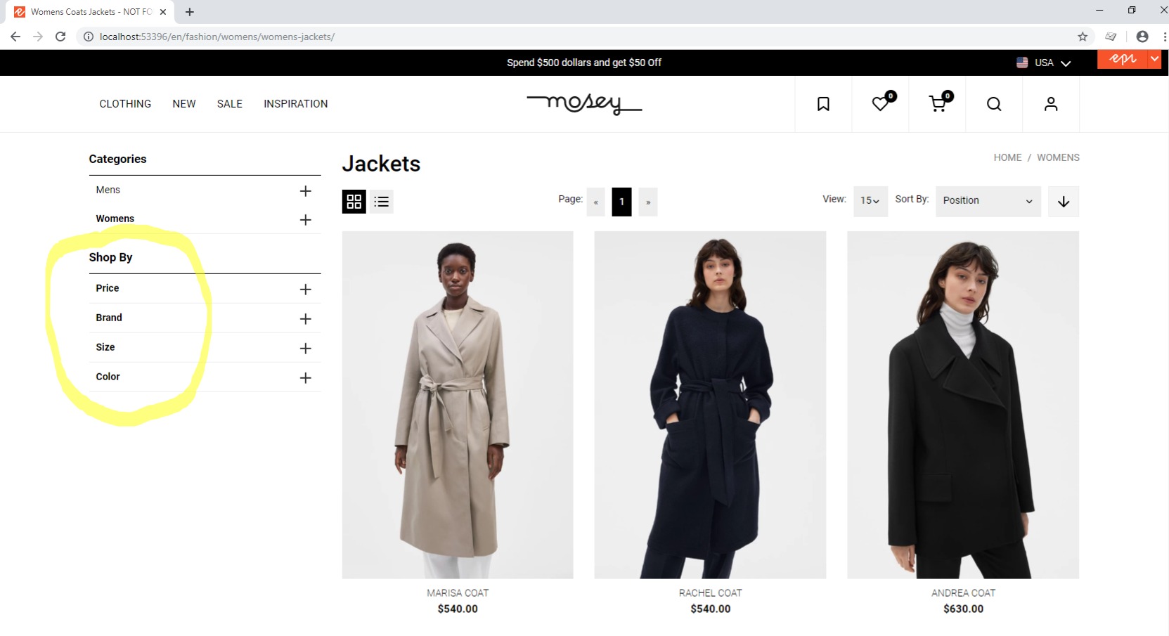- Display direction: vertically or horizontally. For some facets we might want to display the facet options horizontally, one beside the other, like for Size;